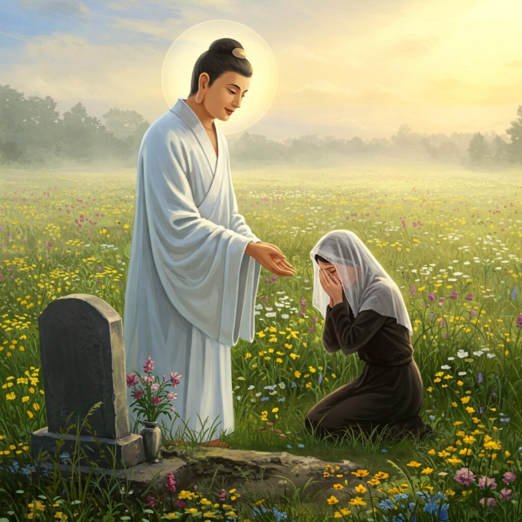 浄土真宗の妙好人として「庄松(しょうま)」という人がおられました。この人は「私は墓の下にはおらん。南無阿弥陀仏の中におるぞ」と言い残しています。