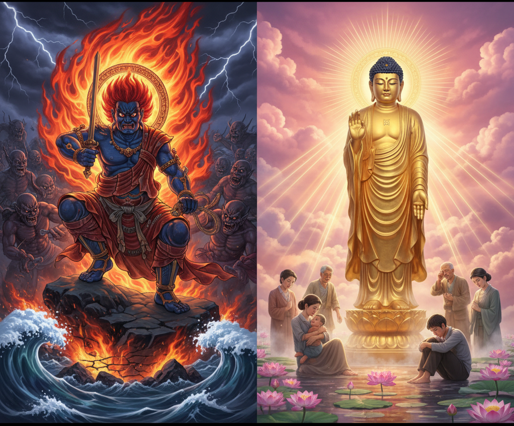 ※上の画像は生成AIが考えた「左半分は、正義のために悪と戦う仏。右半分は、苦しむ人々を救済する阿弥陀仏。」です。