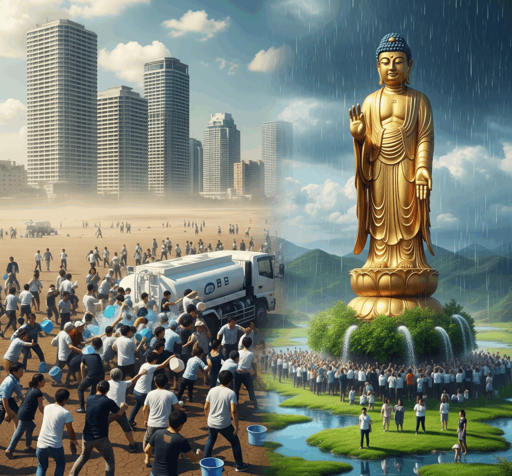 ※上の画像は生成AIが考えた「身も心も渇き水を奪い合う人々と阿弥陀如来の法雨によって今救われている人々」です。
