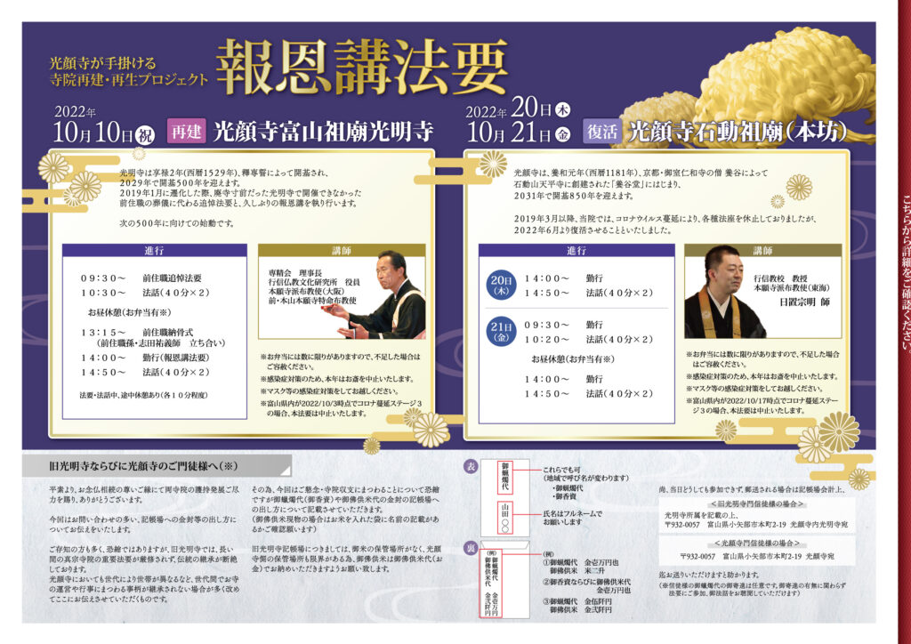 富山祖廟光明寺 前住職追悼法要ならびに報恩講法要のご案内