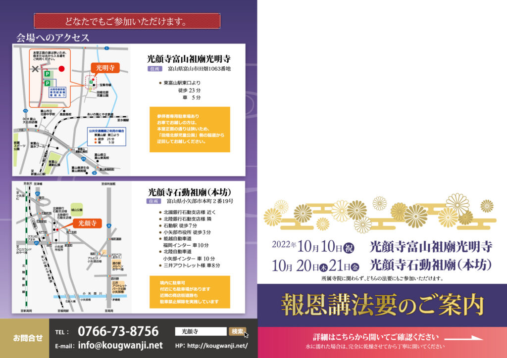 報恩講厳修のご案内(10/10富山祖廟、10/20・21石動祖廟)