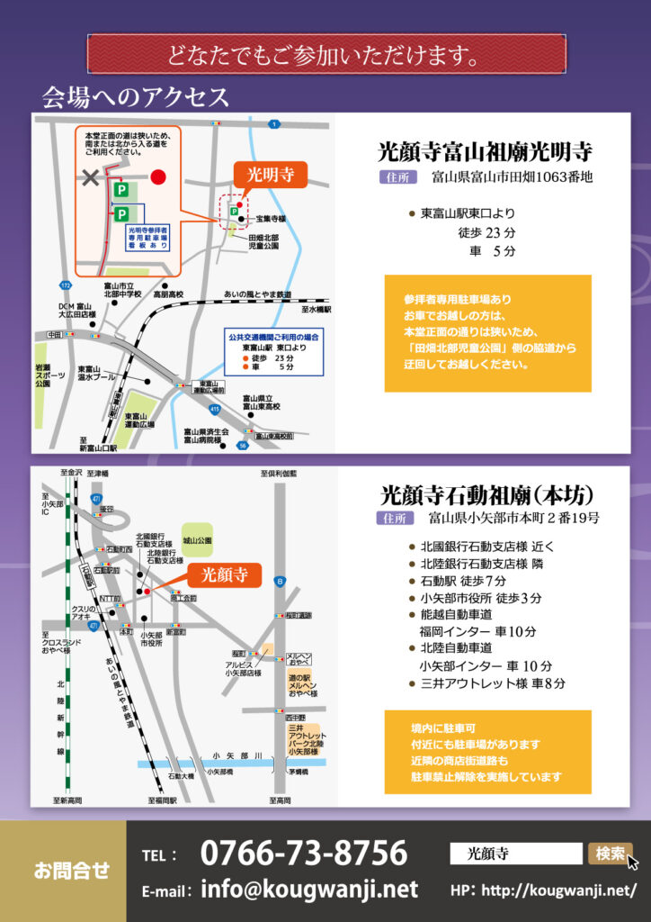 また、長年法座が中止し、当院のもとで再建中の富山祖廟光明寺においても、前住職の追悼法要と久しぶりの報恩講を行います。駐車スペースも広く確保致しましたので、両院の門信徒様ならびに地域の皆様にも広くご参詣・お聴聞いただきたく存じます。