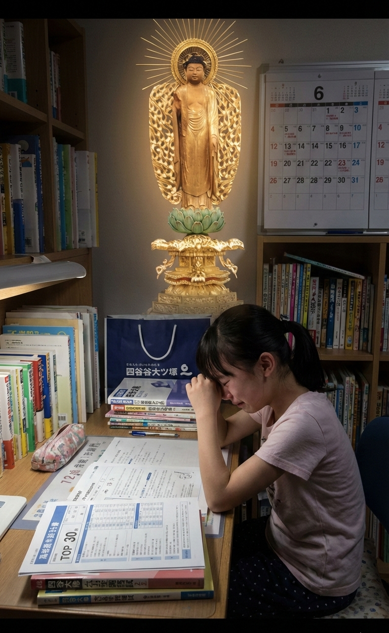 ※上の画像は生成AIが考えた-「模試の結果に将来を悲観する受験生とそれを見守る阿弥陀如来」-です