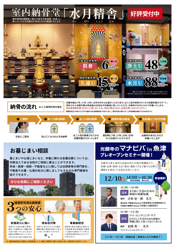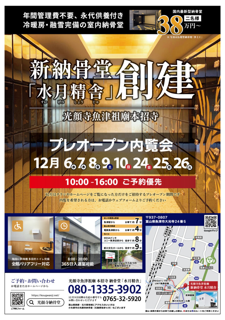 光顔寺納骨堂魚津祖廟本招寺にて、新納骨堂「水月精舎」創建プレオープン記念内覧会を開催いたします。12月はチラシやホームページをご覧になった方だけをご招待するプレオープン期間です。内覧を希望される方は、お電話か下記ウェブフォームよりご予約ください。