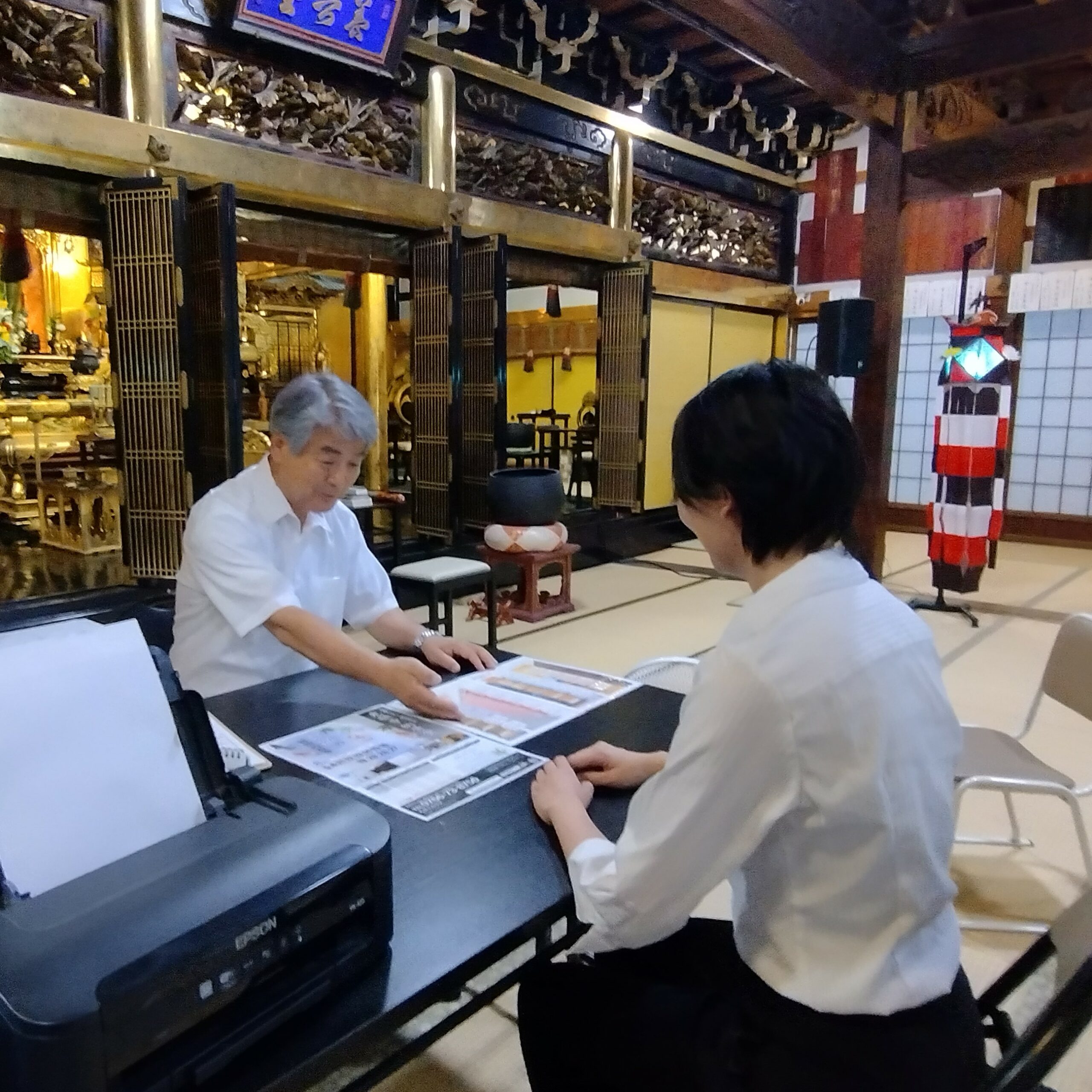 資料作成の傍ら、簡易清掃、納骨堂の内覧者対応。お坊さんとして様々な相談に応じる。