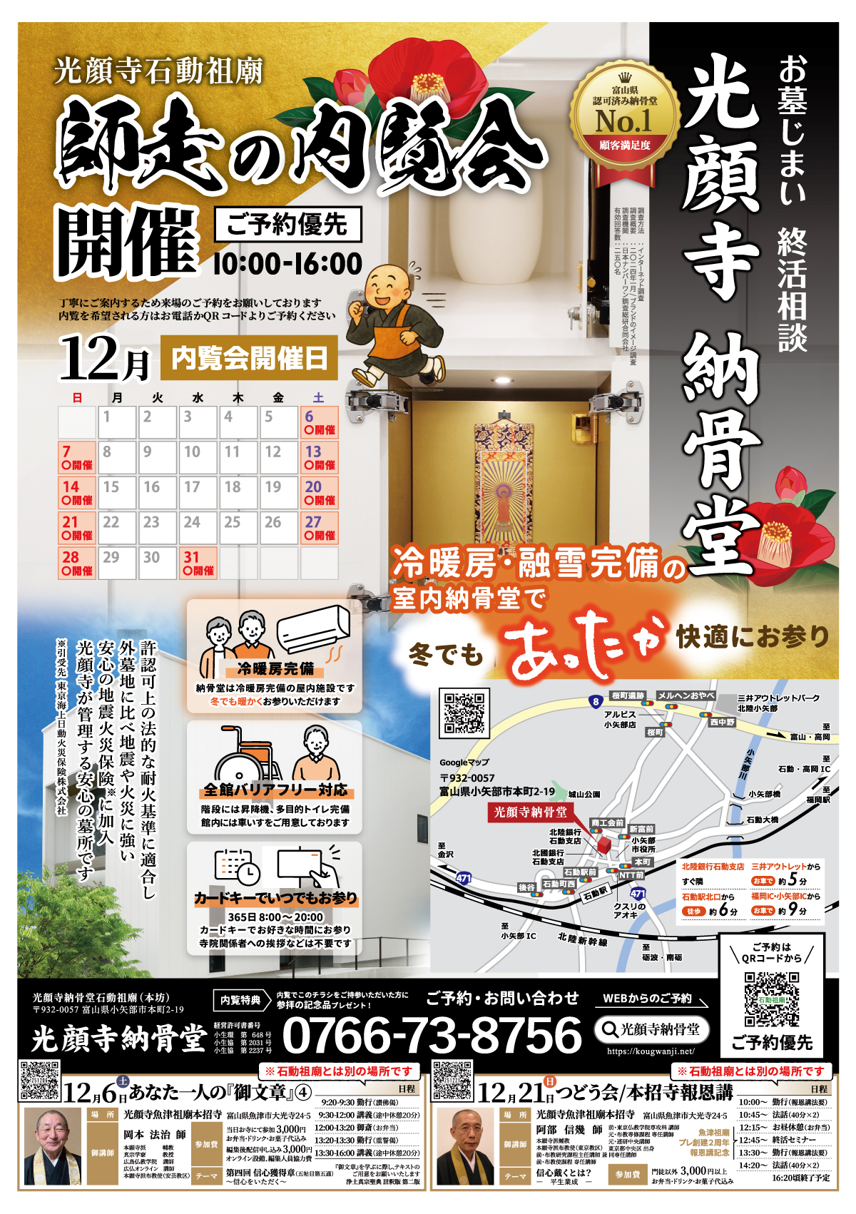 令和6年4月にグランドオープンしました、富山県魚津市の光顔寺魚津祖廟本招寺、新納骨堂「水月精舎」です。新納骨堂「水月精舎」では、毎月内覧会を開催しております。形は新しくなっても、ご供養の心は同じ。冷暖房完備、全館バリアフリーなど、季節のお墓まいりに際して、外の墓所に比べて負担を考えずに済むのが納骨堂の大きな特徴です。当山光顔寺においても、ご安心いただける永代のご供養を務めさせていただきます。ぜひ一度お越しください。
