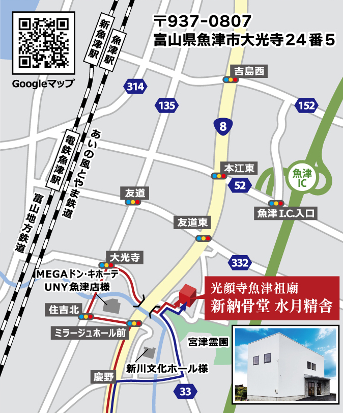 光顔寺ではこの度、新納骨堂「水月精舎」を併設した、富山県内で令和初の新設寺院「光顔寺魚津祖廟本招寺」を魚津市にて令和5年12月に建立いたしました。冷暖房・融雪完備で年中快適にお参りいただけます。内覧会は随時開催しております。富山市や滑川市、黒部市からのアクセスも良好ですので、ぜひお気軽にお問い合わせください。