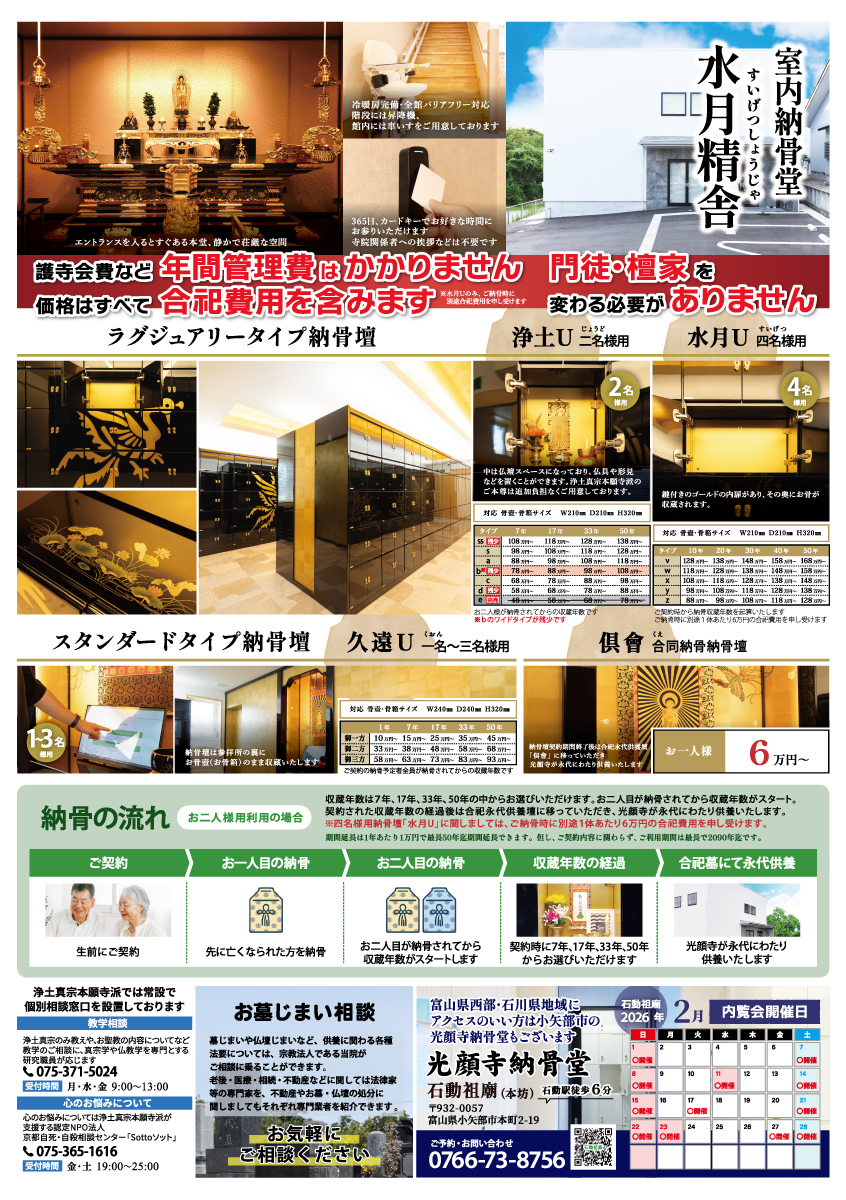 令和6年4月にグランドオープンしました、富山県魚津市の光顔寺魚津祖廟本招寺、新納骨堂「水月精舎」です。新納骨堂「水月精舎」では、毎月内覧会を開催しております。形は新しくなっても、ご供養の心は同じ。冷暖房完備、全館バリアフリーなど、季節のお墓まいりに際して、外の墓所に比べて負担を考えずに済むのが納骨堂の大きな特徴です。当山光顔寺においても、ご安心いただける永代のご供養を務めさせていただきます。ぜひ一度お越しください。