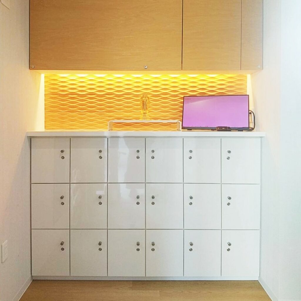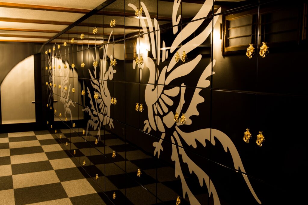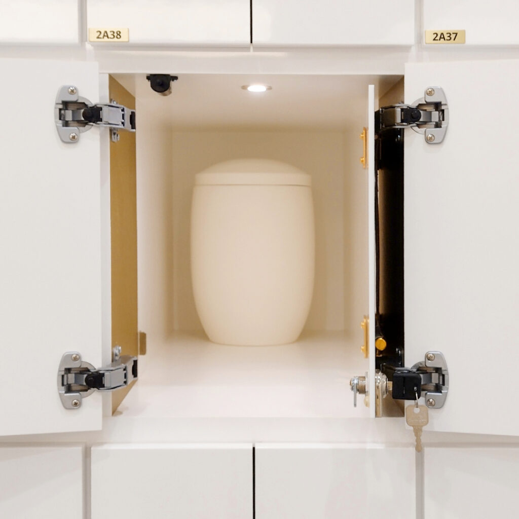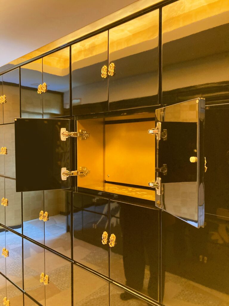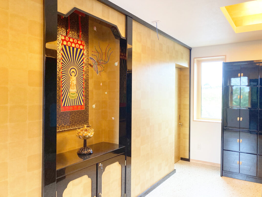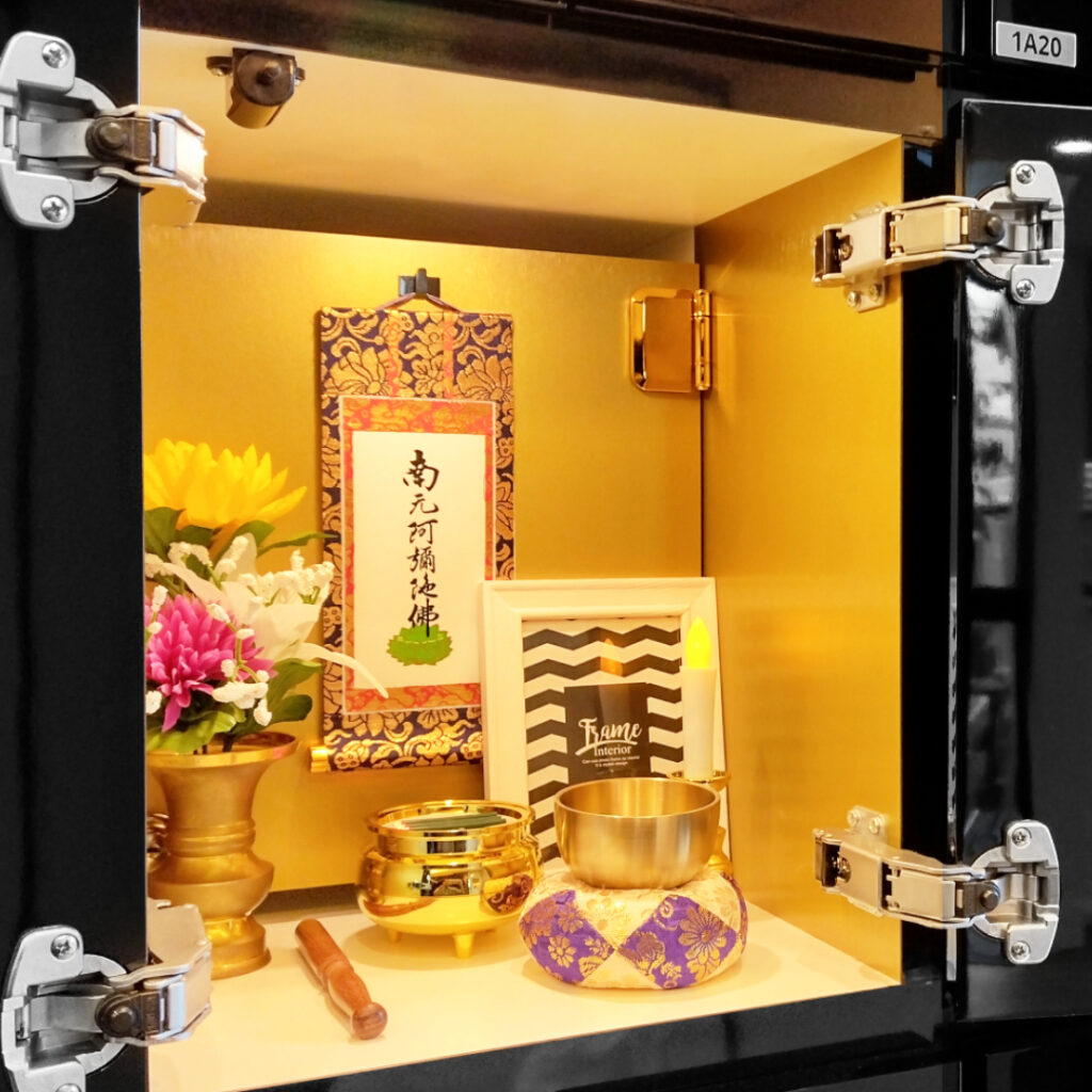 納骨壇の中は仏壇スペースになっており、仏具や形見などを置くことができます。浄土真宗本願寺派のご本尊は追加負担なくご用意しております。奥には鍵付きのゴールドの内扉があり、お骨が収蔵されます。