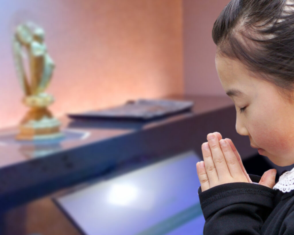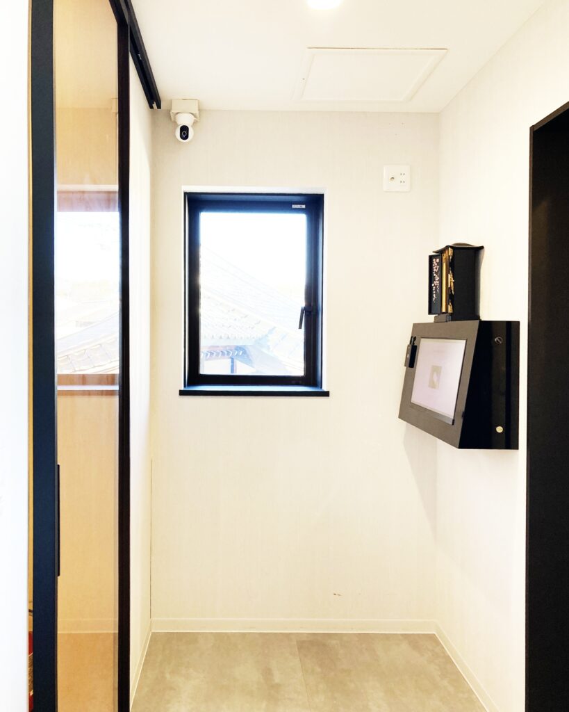 参拝所はブラックでアップライトが美しい荘厳になっています。ご本尊は阿弥陀如来立像、故人の動画・法名などが見られる参拝システム(タッチパネルモニター)が設置されております。